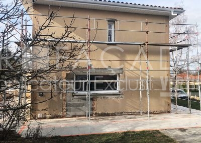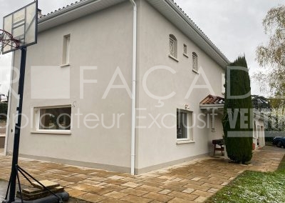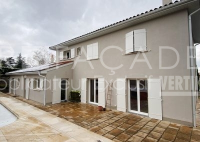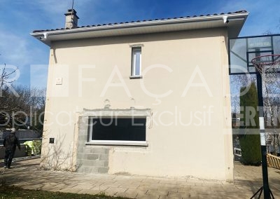 Au départ, les propriétaires de cette maison à Tassin-la-Demi-Lune (69160) nous demandaient l’application d’un nouvel enduit. En tant que spécialistes de la rénovation de façade, nous les avons orienté vers une solution plus pérenne et surtout moins lourde ! En effet, un enduit hydraulique classique pèse entre 15 et 20kg/m2, ce qui après la pose, alourdit les murs SANS GARANTIR UNE PROTECTION DANS LE TEMPS et/ou l’anticipation des problèmes existants. Comme des défauts de planéité devaient être corrigés, nous leur avons suggéré l’application d’un revêtement épais structuré riche en résine appliqué à la taloche (environ 2mm d’épaisseur pour un poids équivalent à 1kg/m2) qui n’alourdit pas les murs et les protège à long terme.