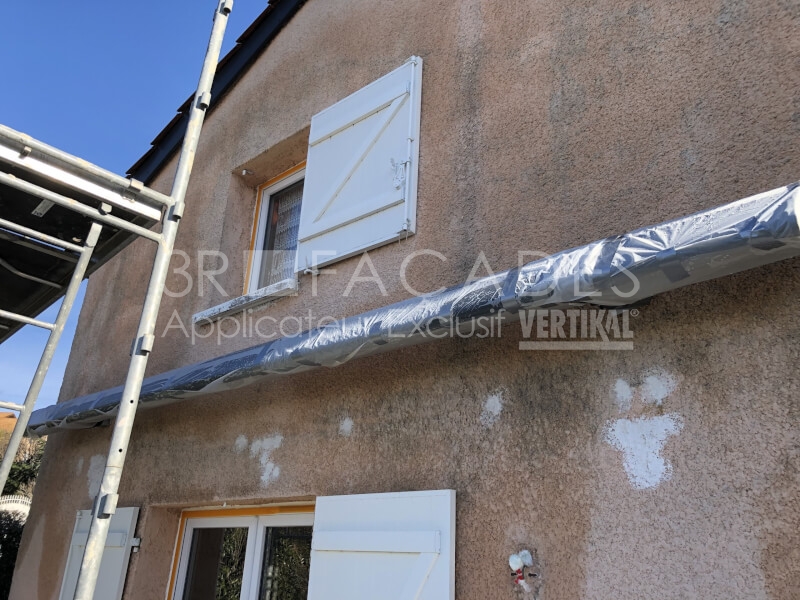 Les cicatrices et les pieds de murs ont été repris au VERTIKAL ENDUIT G, un enduit reboucheur granité et fibré qui évite les effets lisse. Les réparations, après avoir été recouvertes, se fondent dans l’aspect projeté de la maison.