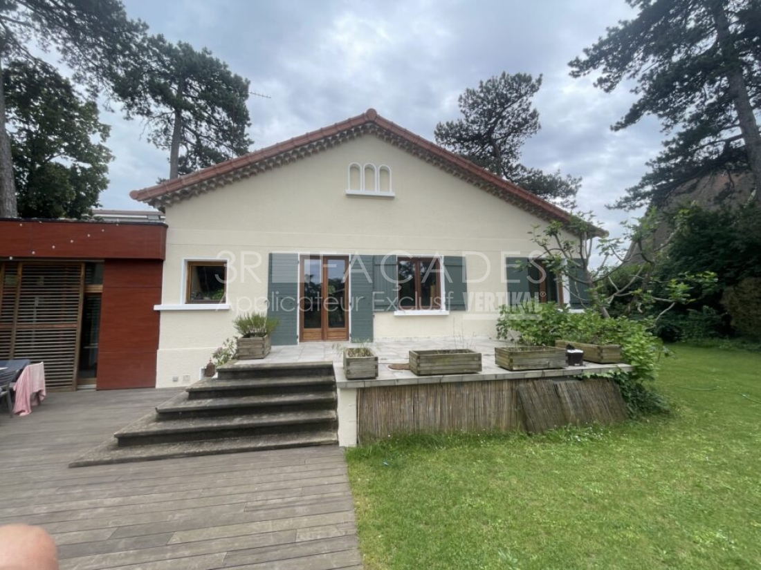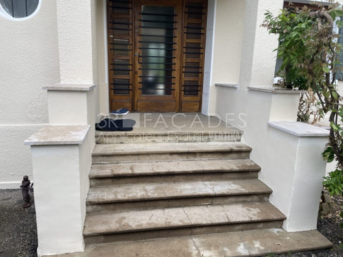 Afin de masquer les traces de fixation de l’ancien store, nous avons soumis l’idée de créer un « frise » ton sur ton, sur toute la largeur de la façade. Après démoussage et lavage HP nous avons repris au mortier fibré tous les défauts que présentait l’enduit. Les fissures on été traitées au mastic spécial façade. Après application d’un primaire très couvrant , nous avons préconisé l’application au rouleau d’un revêtement SEMI EPAIS.. Les couvertines ont été déposées et remplacées par de nouvelles , plus large , en pierre du Sinaï , assorties a la future terrasse.