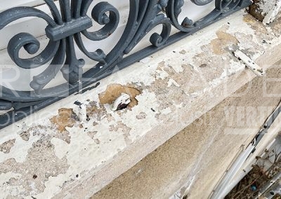 Enfin, pour masquer les réparations, harmoniser et protéger les façades, nous avons utilisé un revêtement mince très riche en résine qui coupe la pénétration d’eau par l’extérieur (imperméabilité), et favorise l’évacuation de l’humidité intérieure (respiration).