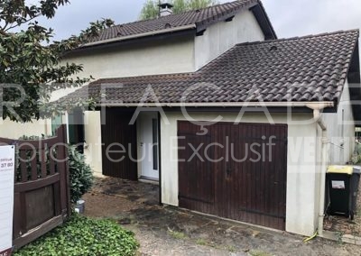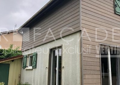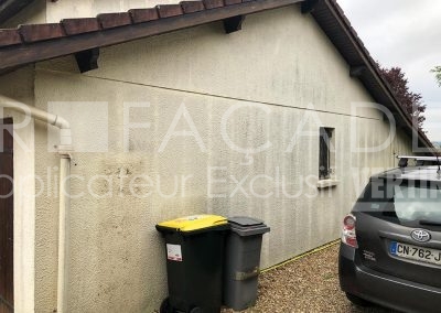 Rénovation d’une maison très encrassée et bardées de fissures dans la commune de Genay ! Pour ce faire, nous avons assaini et démoussé la façade à l’aide d’un fongicide concentré, préventif et non-acide (pour éviter d’abîmer les éléments hors crépis comme le jardin, le bardage bois, et les volets).