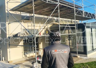 En tant que spécialistes de la rénovation de façades et en réponse aux défauts existants, nous lui avons conseillé l’application d’un revêtement semi-épais très riche en résines qui est plus garnissant et plus épais qu’une peinture classique. Ce produit présente les avantages d’être parfaitement imperméable et respirant : il résiste aux intempéries (pluies battantes, eaux ruisselantes) et favorise l’évacuation de la bulle d’humidité contenue à l’intérieur de la maison. Enfin, son onctuosité permet de combler les micro-fissures et sa souplesse anticipe leur retour.