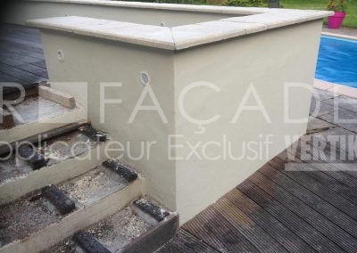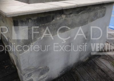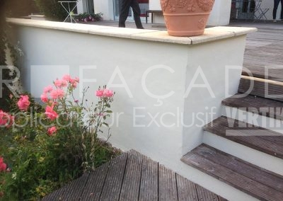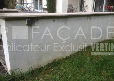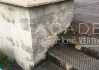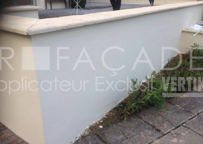 En tant que spécialistes de la rénovation de façades, nous avons préconisé l’ajout d’une couvertine béton (ou chapeau) sur les têtes de murets. Sans cela, l’eau pénètre par la surface horizontale, les fonds constamment humides ne sèchent pas et deviennent la source principale des défauts cités plus haut. En effet, une couvertine empêche l’eau de pénétrer par le haut. De même, il faut qu’elle soit plus large que le muret en lui-même pour éviter le ruissellement directement sur le crépi.