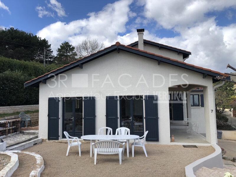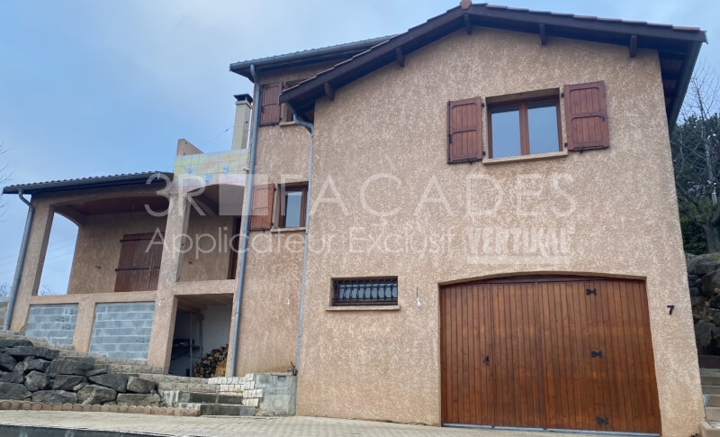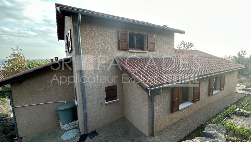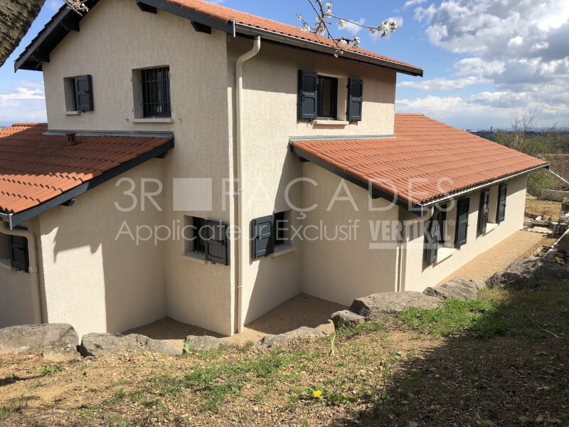 Cette maison située dans la commune de Couzon-au-Mont-d’Or (69270) d’un aspect écrasé ne convenait pas à ses nouveaux propriétaires. Ceux-ci souhaitaient la moderniser, tout en corrigeant les défauts de façade existants, notamment, une des faces de la maison avait déjà connu un agrafage (cf : https://wikitravo.fr/videos-conseils/comment-reparer-de-grosses-fissures/). Des moellons nus étaient apparents, les pieds de murs tombaient et se décollaient des fonds, plusieurs fissures couraient ça et là, et les murs souffraient de leur manque de protection face à l’humidité extérieure (pluie, brume, brouillard, humidité ambiante…).