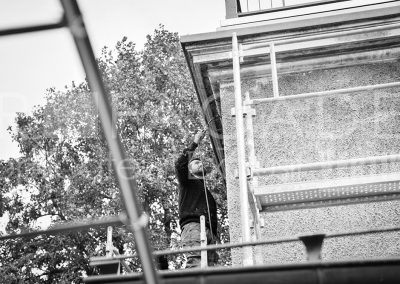 - Pulvérisation d’un fongicide non-acide et lavage des façades à moyenne pression.