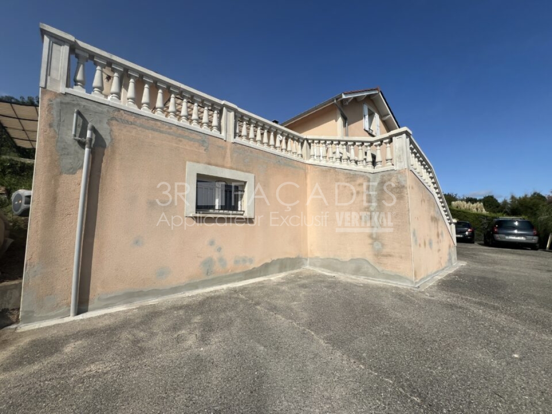 Après analyse du support et inventaire des défaut , nous avons préconiser un lavage haute pression après pulvérisation d’un nettoyant très puissant afin d’assainir le support , une reprise complète des fissures et trous à l’aide d’un mortier de réparation fibré, après séchage, application manuelle à la taloche d’un revêtement épais structuré avant frisage manuelle de l’enduit .