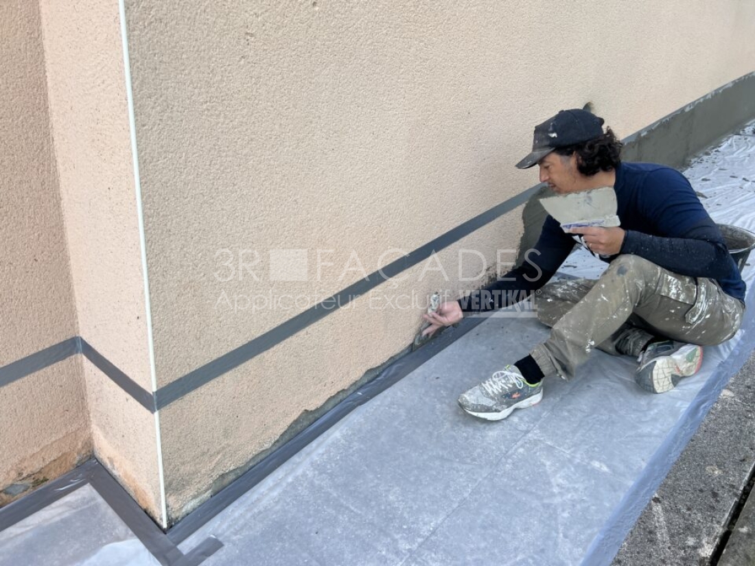 Après analyse du support et inventaire des défaut , nous avons préconiser un lavage haute pression après pulvérisation d’un nettoyant très puissant afin d’assainir le support , une reprise complète des fissures et trous à l’aide d’un mortier de réparation fibré, après séchage, application manuelle à la taloche d’un revêtement épais structuré avant frisage manuelle de l’enduit .